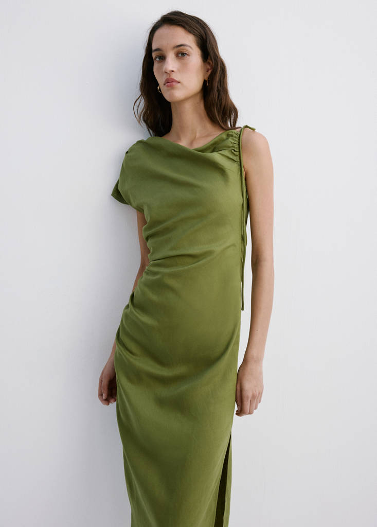 Linen and lyocell blend fabric. Midi design. Asymmetric design. Side ruffles. Short sleeves. Available Plus