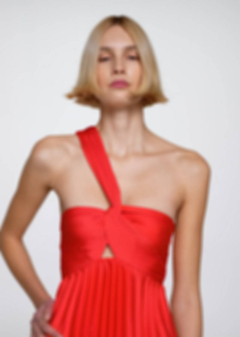 Fluid fabric. Long design. A-line design. Pleated design. Asymmetric design. Low neckline. Sleeveless. Wide strap. Invisible lateral zip fastening. Knot detail. Multi-position suspenders. Inner lining. Party, ceremony and communion collection. This garment belongs to our event collection, designed to make you the perfect guest at any party, wedding or ceremony