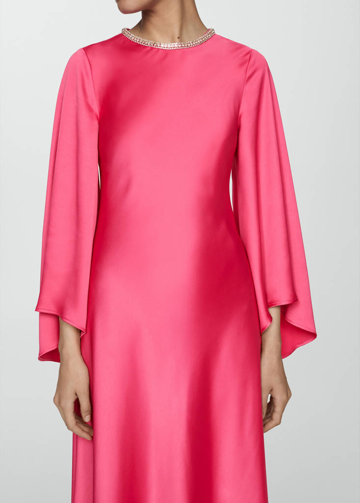 Flared-sleeve satin dressCurrent price [US$ 139.99 ]US$ 139.99Select a colourPinkThe model is wearing size S and is 180cm tall.Select your sizeXSSMLXLDimensionsAdd to WishlistSee lookFree delivery to storeSatin fabric. Long design. A-line design. Round neck. Long flared sleeve. Invisible back zip fastening. Beaded detailDetails, composition and careStore availability