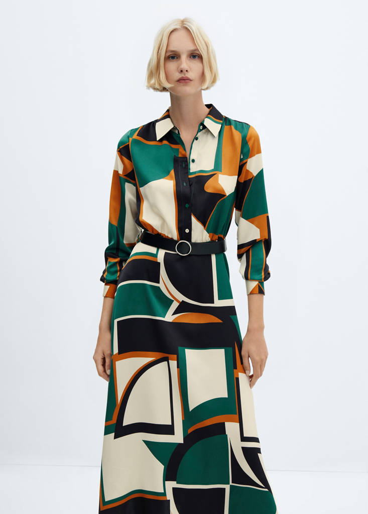 Fluid fabric. A-line design. Long design. Geometric design. Shirt collar. Long sleeves with buttoned cuffs. Front button closure. Removable belt. Available Plus. Office looks