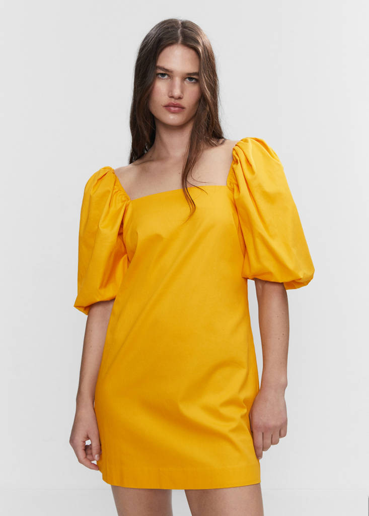 100% cotton fabric. Fitted design. Short design. Available in plain and patterned. Strapless. Puffed short sleeve. Zip fastening on the back section. Inner lining. The yellow model is an online exclusive