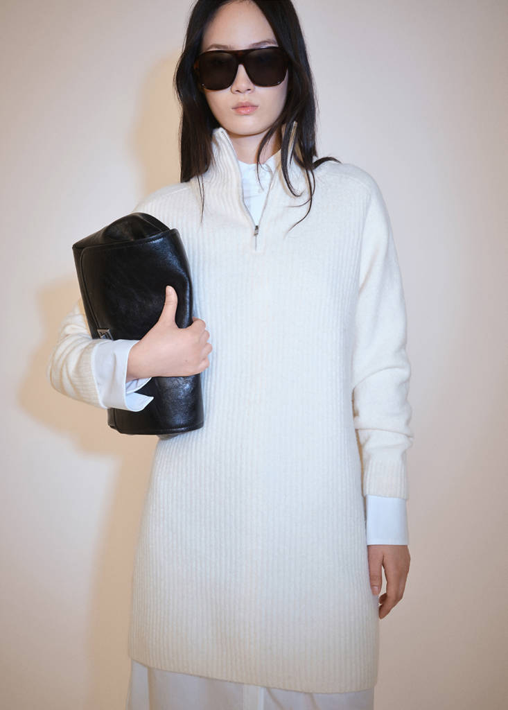 Ribbed knit fabric. Straight design. Short design. Perkins neck with zip. Long sleeves. Size: 28.5x8x2 cm
