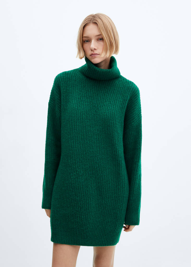 Ribbed turtleneck dressCurrent price [US$ 59.99 ]US$ 59.99Select a colourDark GreenThe model is wearing size S and is 180cm tall.Select your sizeXXSXSSMLXLXXLDimensionsAdd to WishlistSee lookFree delivery to storeWool mix fabric. Cable knit fabric. Short design. Oversized design. Roll neck. Long sleeves. No Fastening. Dropped shoulder seams. Ribbed finishesDetails, composition and careStore availability