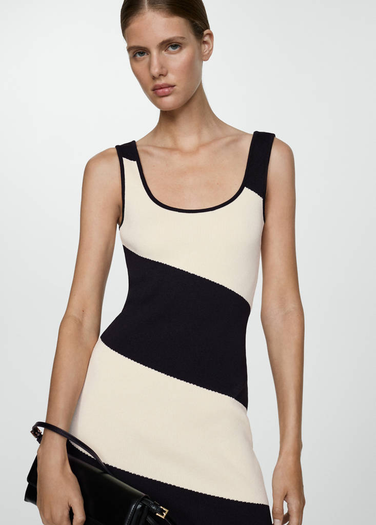 Fine-knit fabric. Midi design. Striped print. Round neck. Wide straps. Fitted design