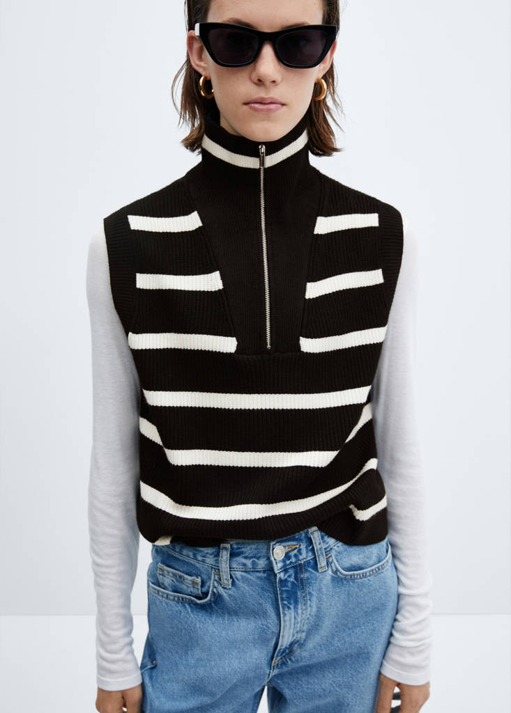 Striped gilet with zipCurrent price [US$ 49.99 ]US$ 49.99Select a colourBlackSelect your sizeXXSXSSMLXLXXL1XL2XL3XL4XLAdd to WishlistSee lookFree delivery to storeKnit fabric. Straight design. High neck. Sleeveless. Ribbed finishes. Available Plus. Size: 28.5x8x2 cmDetails, composition and careStore availability
