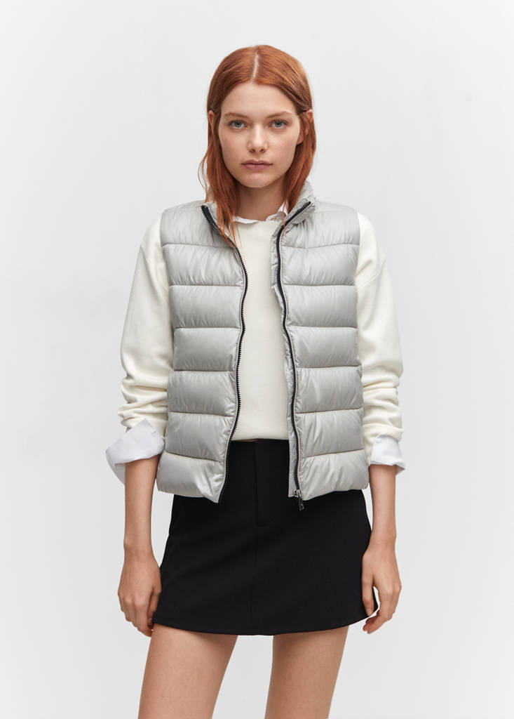 Quilted fabric. Short design. High neck. Sleeveless. Side zip pockets. Recycled polyester padding. Zip fastening on the front section. Available Plus. Water-repellent: The durable finish of this garment protects against light rain, repelling contact with water and raindrops