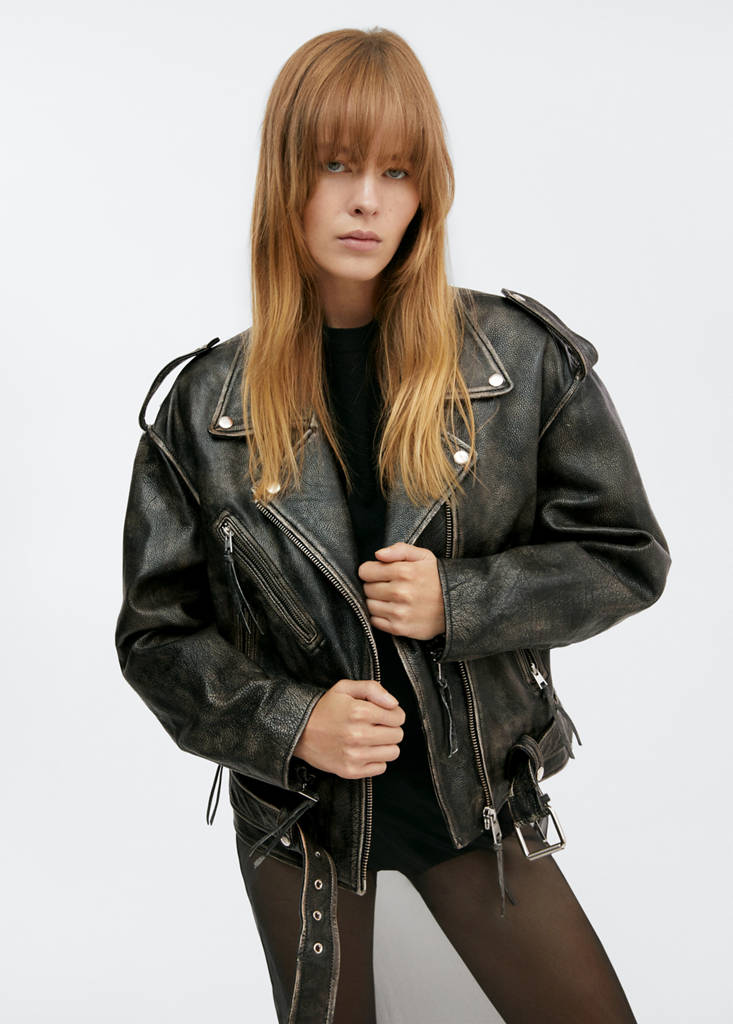 100% bovine leather. Oversized design. Biker design. Short design. Lapel with notch. Loops on the shoulders. Zip fastening on the front section. Belt buckle fastening. Decorative zips. Inner lining. Belt loops. Selection Collection