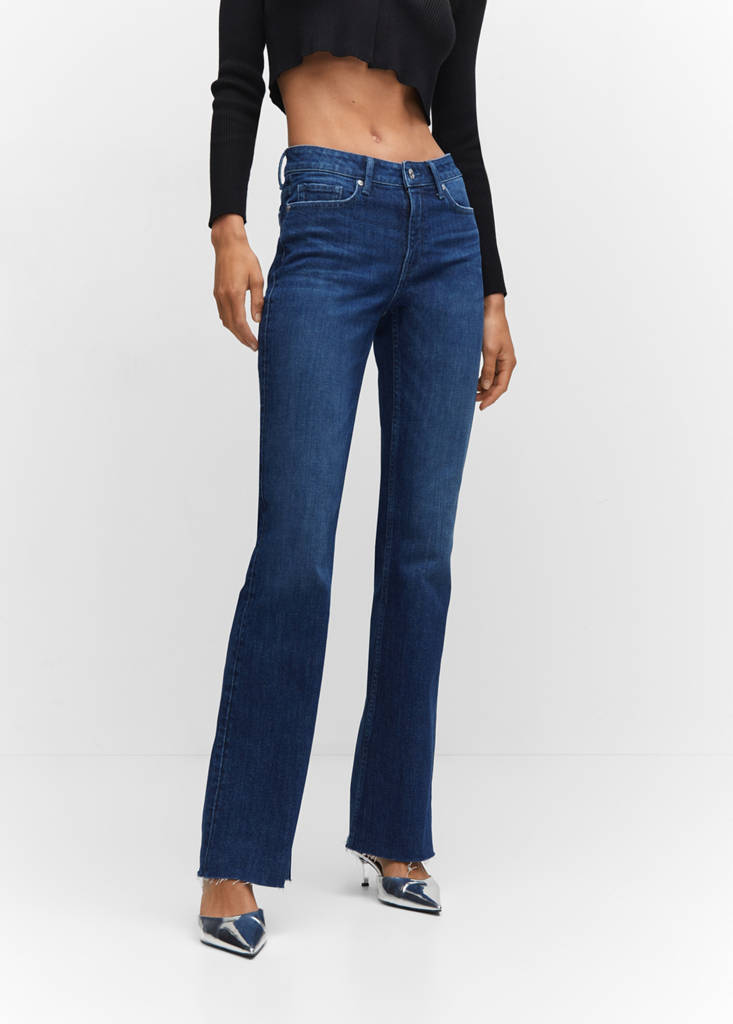 Denim-style cotton fabric. Flared design. Mid-rise. Belt loops. Five pockets. Zip and button fastening. Frayed hem. Inseam 84 cm. Available Plus. Full length