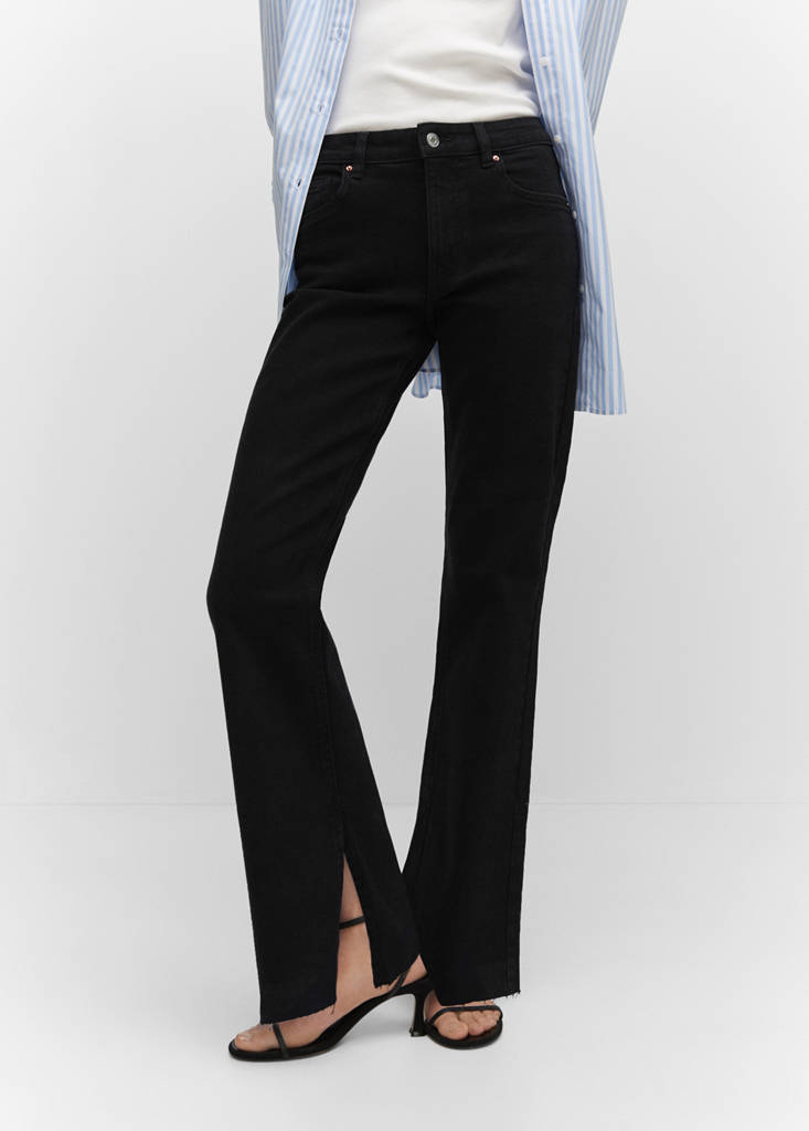 Denim-style cotton fabric. Stretch fabric. Straight design. Long design. Mid-rise. Two side pockets. Two patch pockets at the back. Zip and button fastening. Frayed hem. Hem slits. Inseam 80 cm. Full length