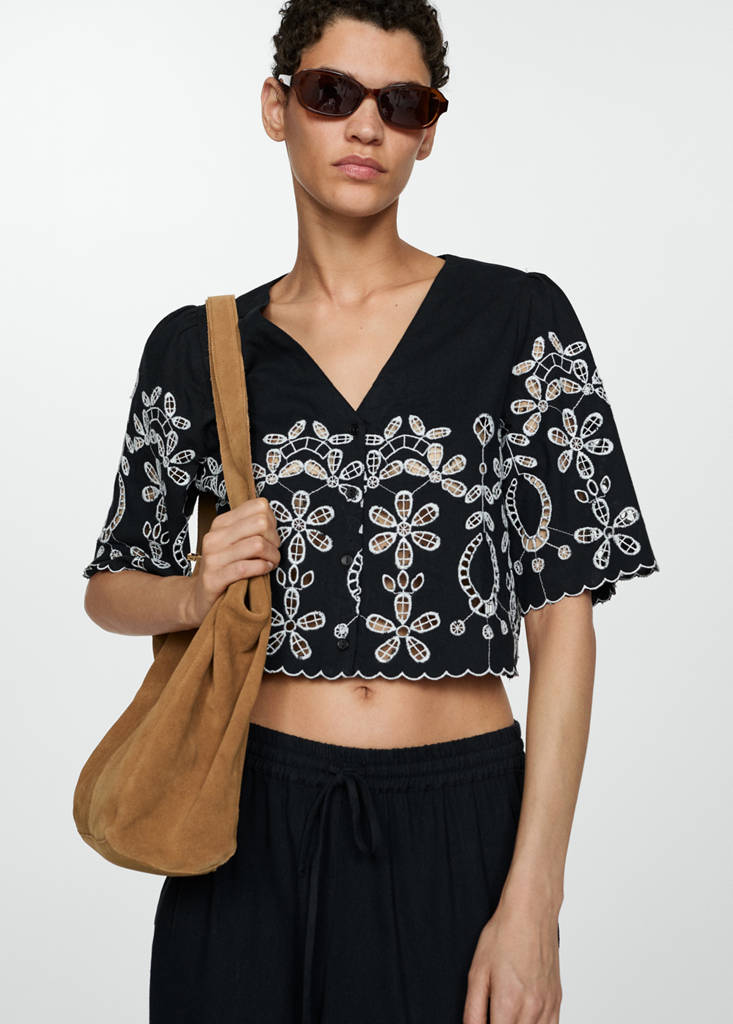 Lightweight fabric. Crop design. V-neck. Puffed sleeves. Openwork details. Embroidered details. Total look