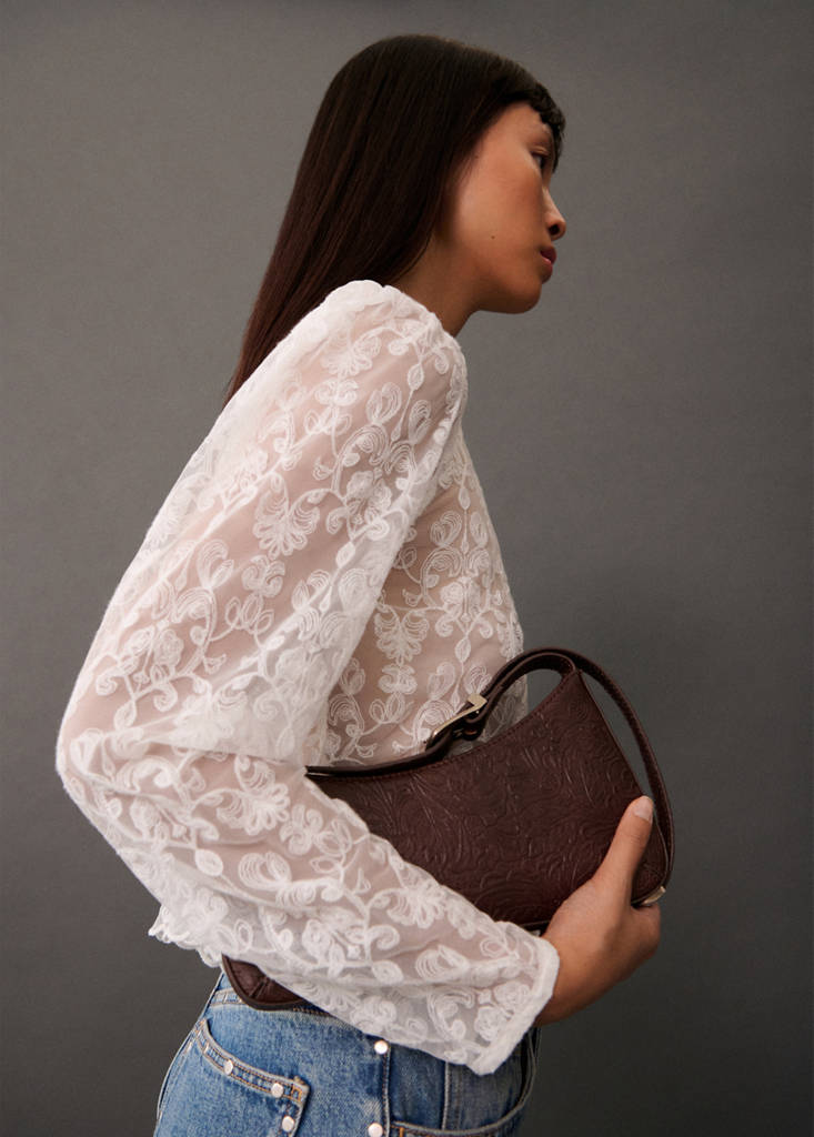 Lightweight fabric. Semi-transparent fabric. Straight design. Crop design. Round neck. Button fastening at the neck. Long sleeves
