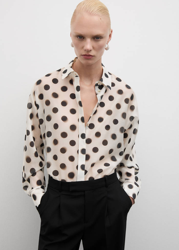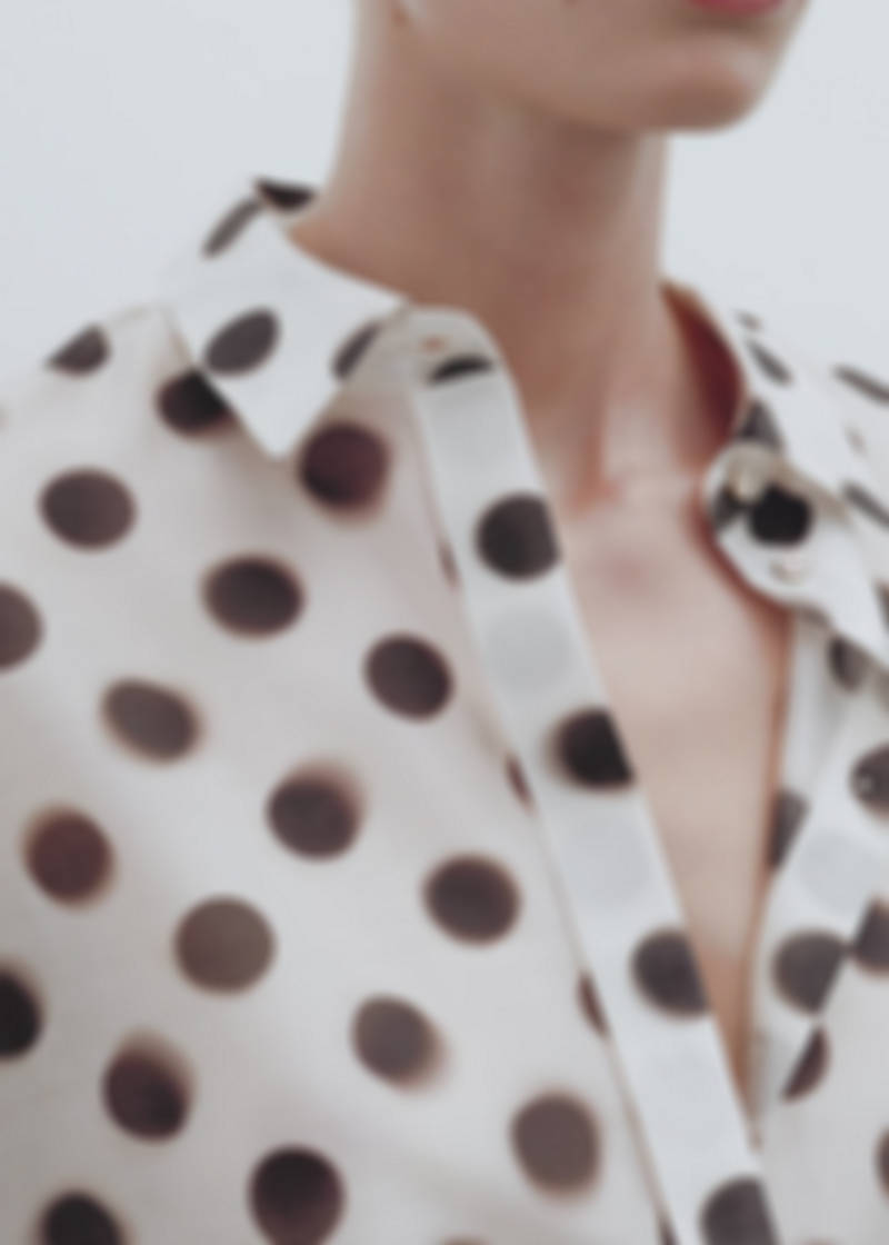 Lyocell-blend fabric. Semi-transparent fabric. Straight design. Spots print. Shirt collar. Long sleeves with buttoned cuffs. Front button fastening with concealed placket