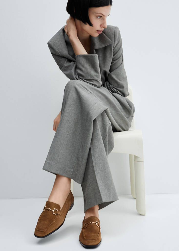 100% bovine leather. Suede. Round toe. Flat. No Fastening. Metallic detail. Inner lining