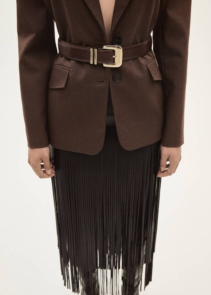 Faux leather. Straight design. Midi design. High waist. Zip fastening on the back section. Fringed finish