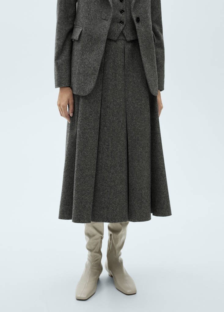 Wool mix fabric. Speckled jacquard. Patterned design. A-line design. Midi design. Mid-rise. Invisible back zip fastening