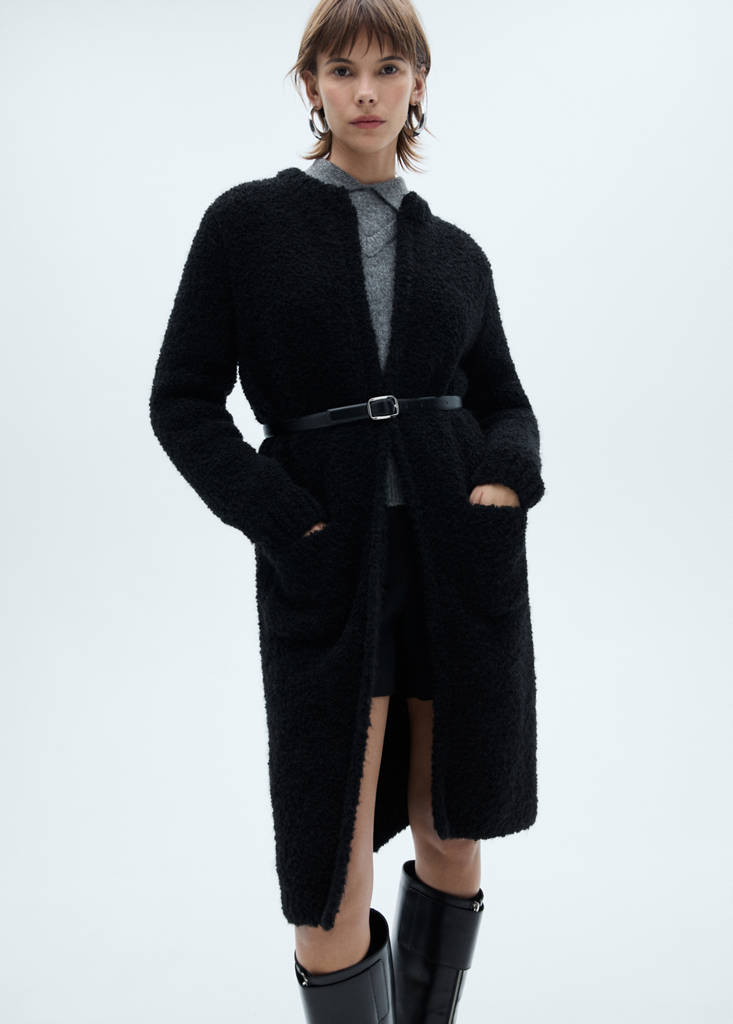 Chunky knit fabric. Bouclé fabric. Midi design. Straight design. Round neck. Long sleeves. Two patch pockets at the front