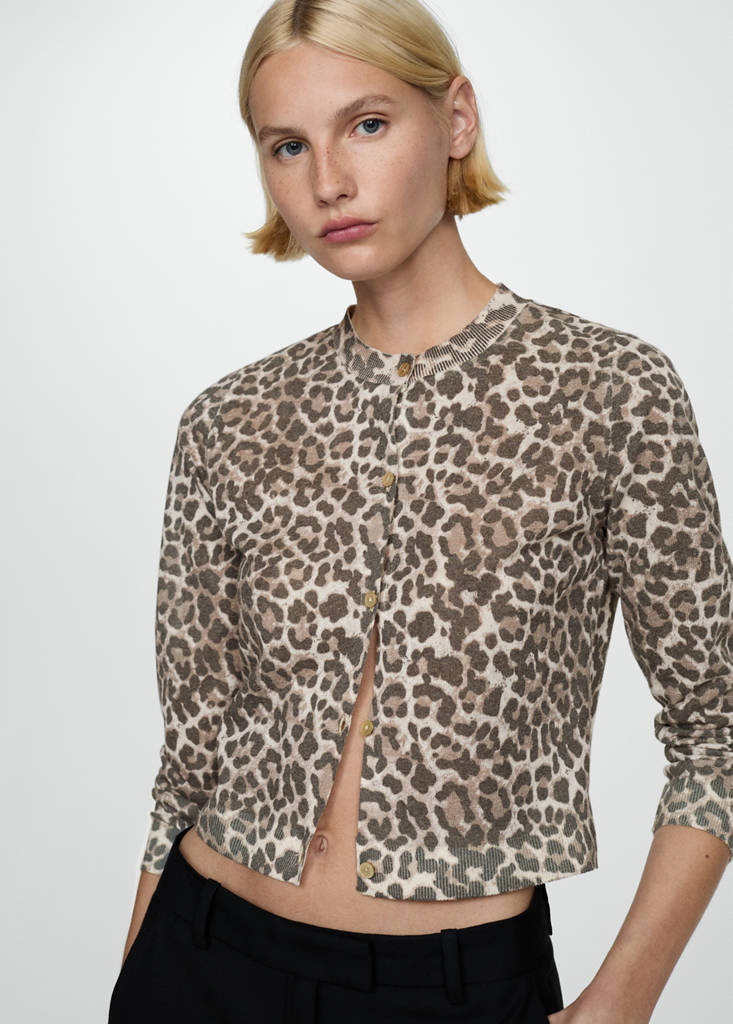 Fine-knit fabric. Cotton blend fabric. Straight design. Leopard design. Animal print. Round neck. Long sleeves. Front closure with buttons