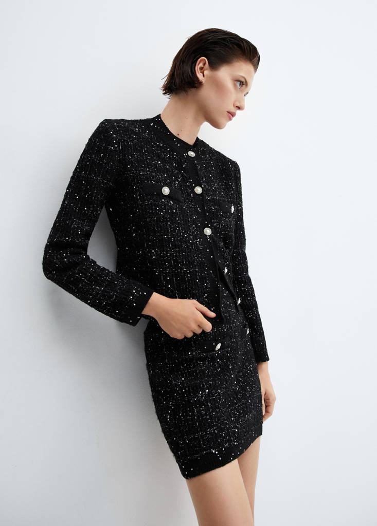 Recycled cotton-blend fabric. Tweed fabric. Midpoint. Straight design. Round neck. Long sleeves. Chest welt pocket. Jewel-effect buttons. Sequin detail. Available Plus. Total look. Front closure with buttons