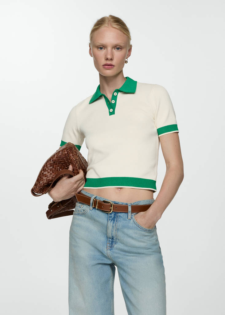 Fine-knit fabric. Straight design. Polo collar. Short sleeves. Button fastening at the neck. Contrast trims