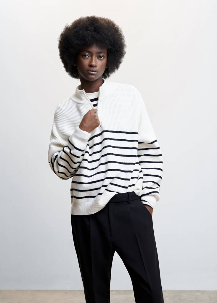Thick knitted fabric. Oversize design. Straight design. Striped print. Perkins neck with zip. Long sleeve. Dropped shoulder seams. Plus Size Available. One of the colours is an online exclusive