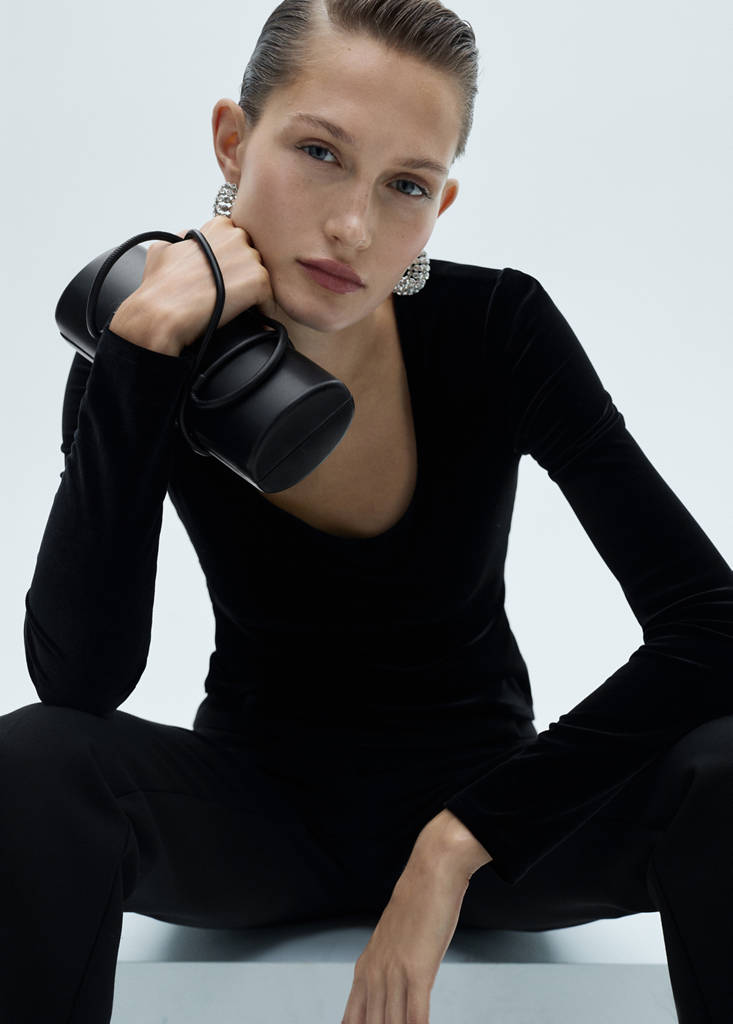 Low-cut velvet t-shirtCurrent price [US$ 39.99 ]US$ 39.99Select a colourBlackSmall garment - Choose one size up from the usualSelect your sizeXXSXSSMLXLXXL1XL2XL3XL4XLAdd to WishlistSee lookFree delivery to storeVelvet fabric. Fitted design. Round neck. Low neckline. Long sleeves. No Fastening. Available Plus. Party, ceremony and communion collectionDetails, composition and careStore availability