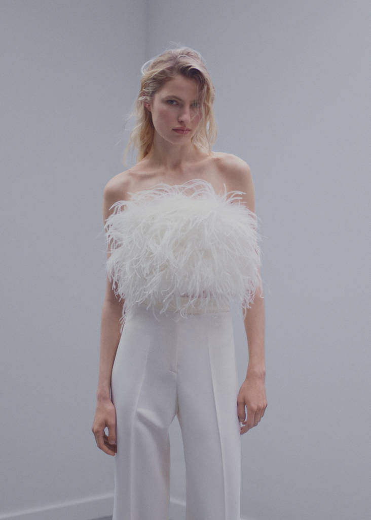This feather bandeau-style top offers sophistication, but also a fun, rejuvenating and different air. Achieve a striking result with matching trousers. Feather-finish fabric. Bandeau design. Crop design. Sleeveless. Strapless. Zip fastening on the back section. Made in Morocco. This garment contains a corset zip with a special closure. We recommend steaming the garment as little as possible, since it is distributed ironed. Party, ceremony and communion collection. Items from the CAPSULE collection can be exchanged or returned within 14 days from the date of shipment. This garment belongs to our event collection, designed to make you the perfect guest at any party, wedding or ceremony