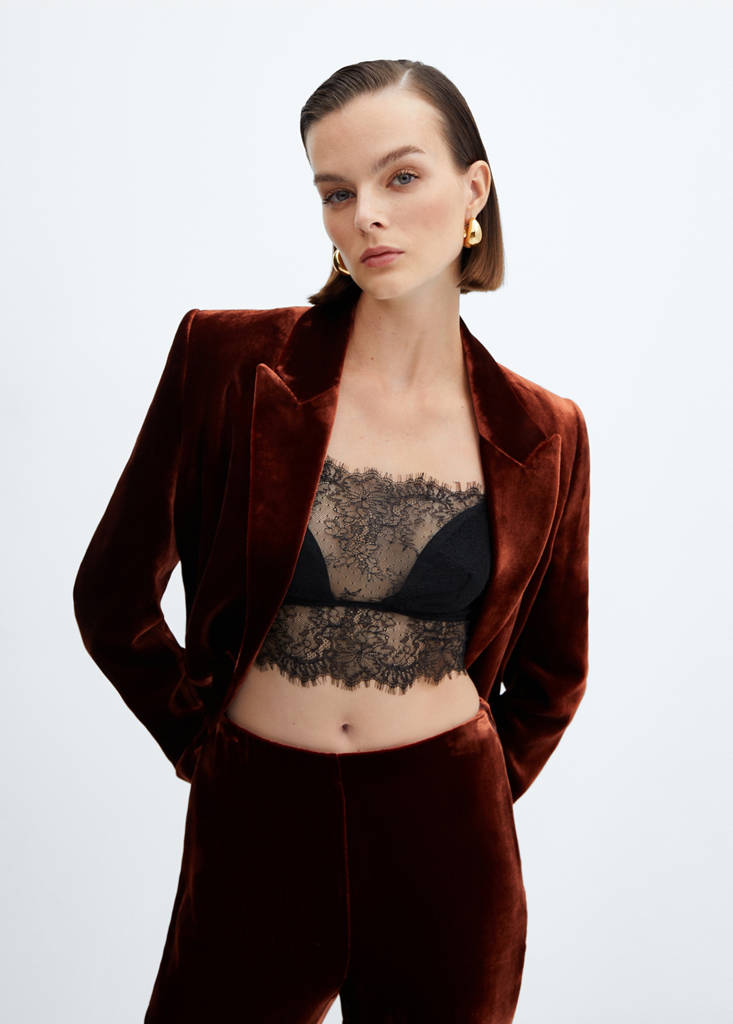 Lace fabric, bralette, thin adjustable straps, hook fastening on the back section, inner lining, party and events collection.