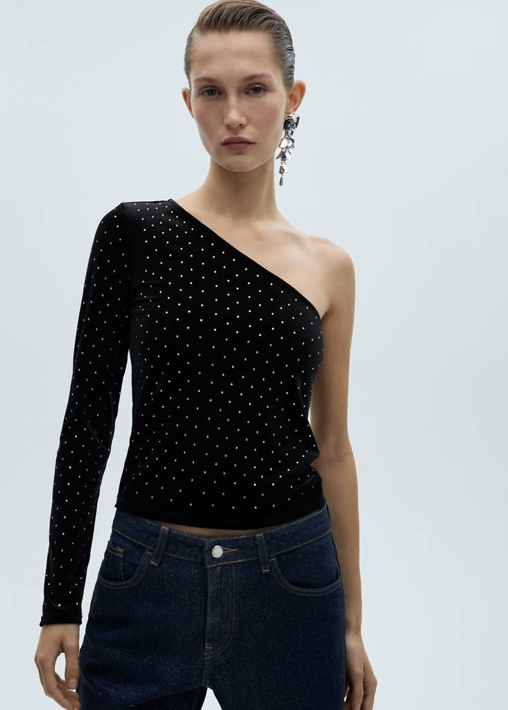 Velvet fabric. Straight design. Strass design. Asymmetric neckline. Long sleeves. Crystals appliqué. Party, ceremony and communion collection