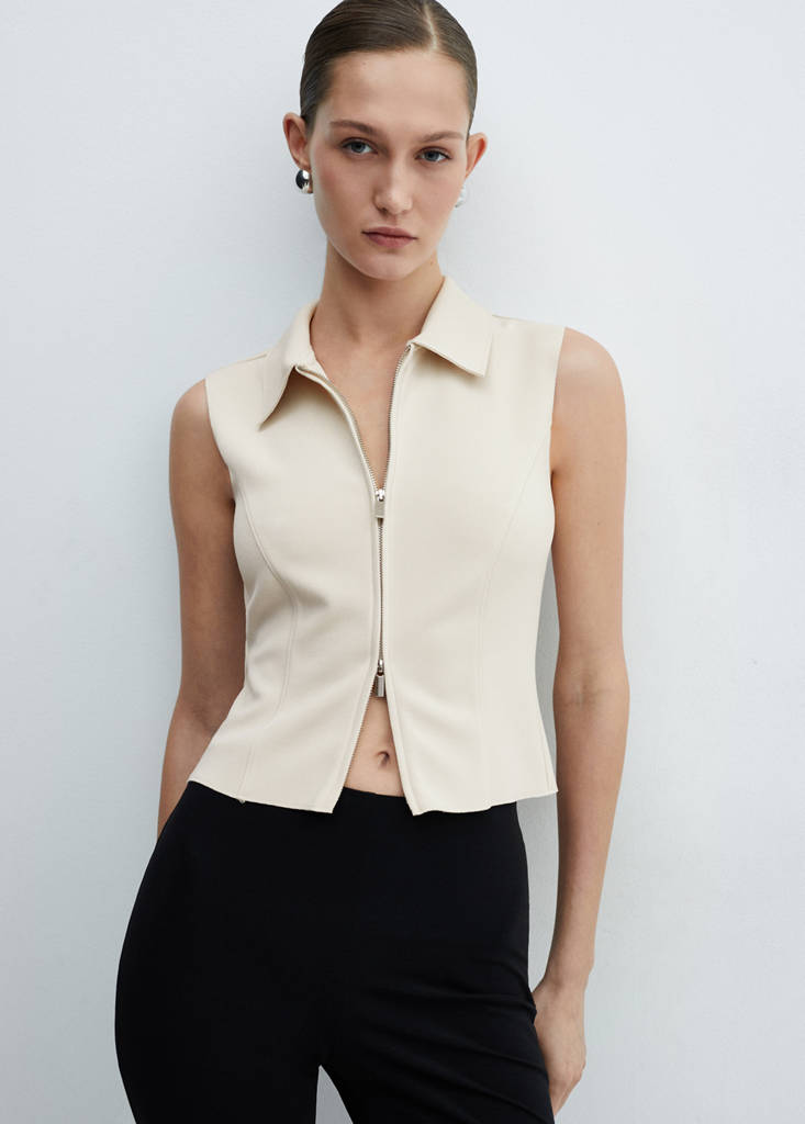 Crop top with zipCurrent price [US$ 45.99 ]US$ 45.99Select a colourEcruThe model is wearing size S and is 178cm tall.Select your sizeXSSMLXLDimensionsAdd to WishlistSee lookFree delivery to storeFluid fabric. Crop design. Sleeveless. Notched lapel collar. Front zip closure. Fitted designDetails, composition and careStore availability