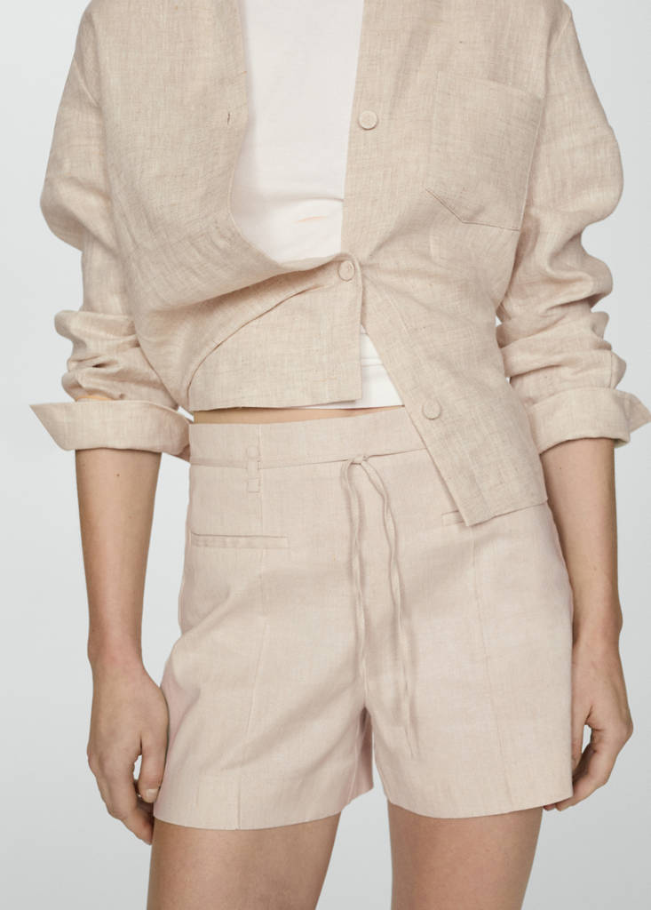 Linen and cotton blend fabric. Mid-rise. Short design. Skinny fit. Two front welt pockets. Belt loops. Invisible lateral zip fastening. Tie fastening