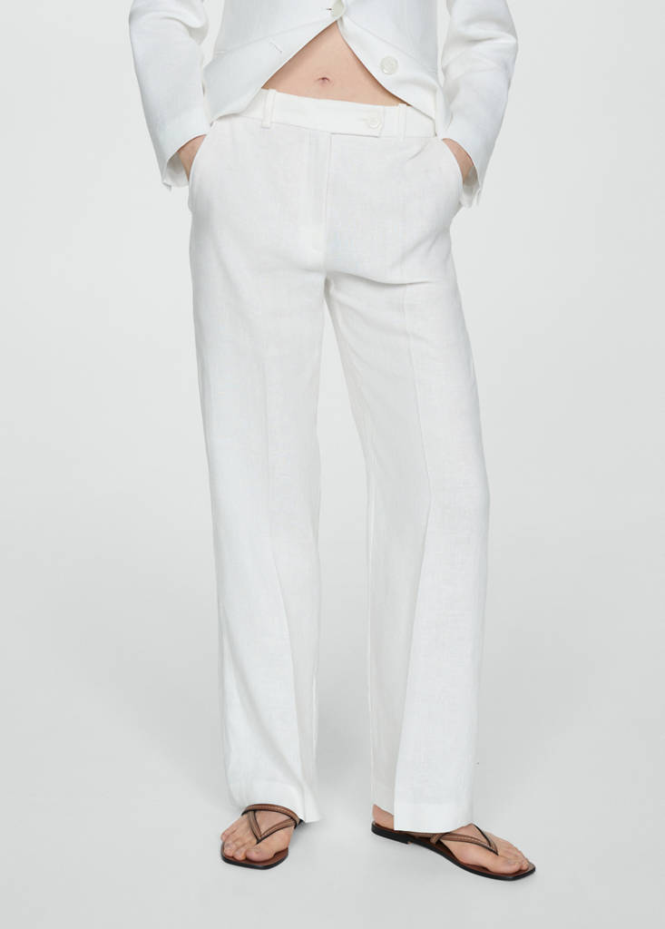 100% linen fabric. Long design. Mid-rise. Suit style. Belt loops. Two side pockets. Concealed button, hook and zip fastening. Total look