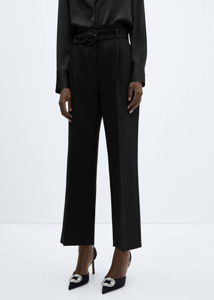 Fluid fabric. Paperbag. Crop design. Straight design. Concealed button, hook and zip fastening. Adjustable belt. Belt loops. Two side pockets. Available Plus. Office looks