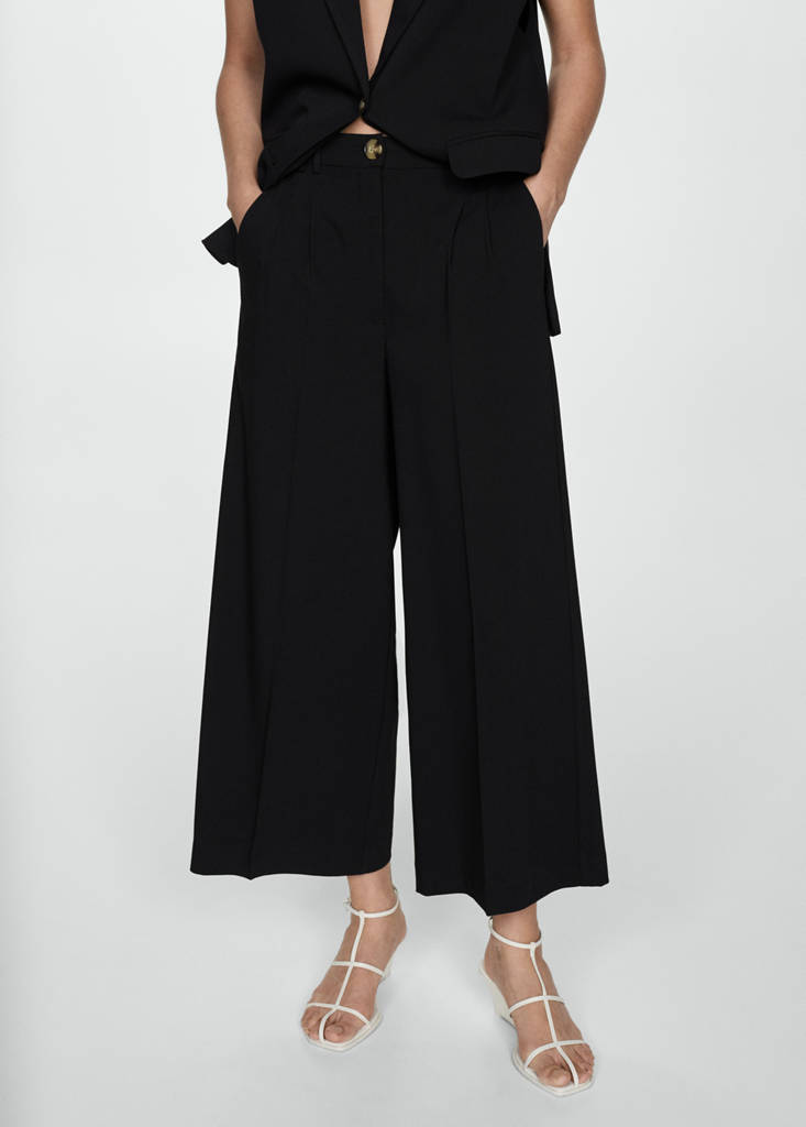 Culotte design. Crop design. Belt loops. Side pockets. Elasticated waistband. Zip and button fastening. Dart detail. Total look. Office looks