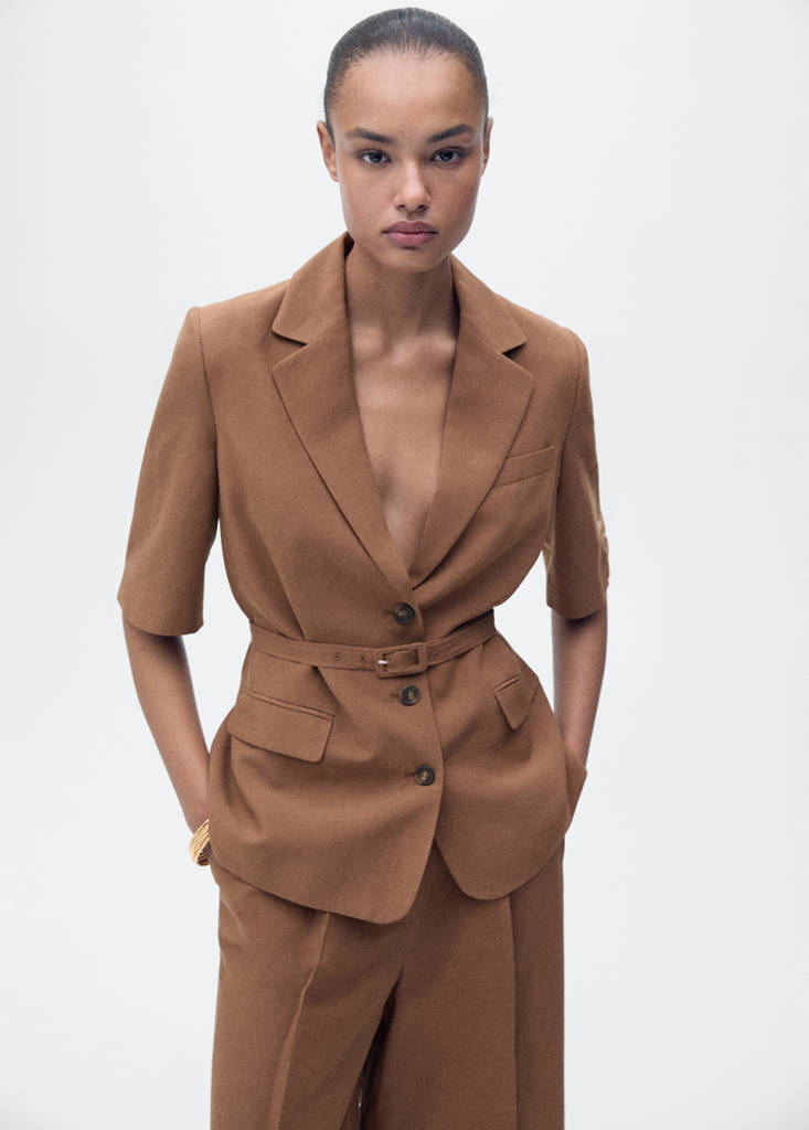 Tissu en lin mélangé. Style tailleur. Coupe droite. Col en V avec rabat. Revers à encoche. Manches trois-quarts. Passants de ceinture. Ceinture avec fermeture à boucle. Deux poches à rabat sur les côtés. Fermeture avant avec boutons. Total look.
