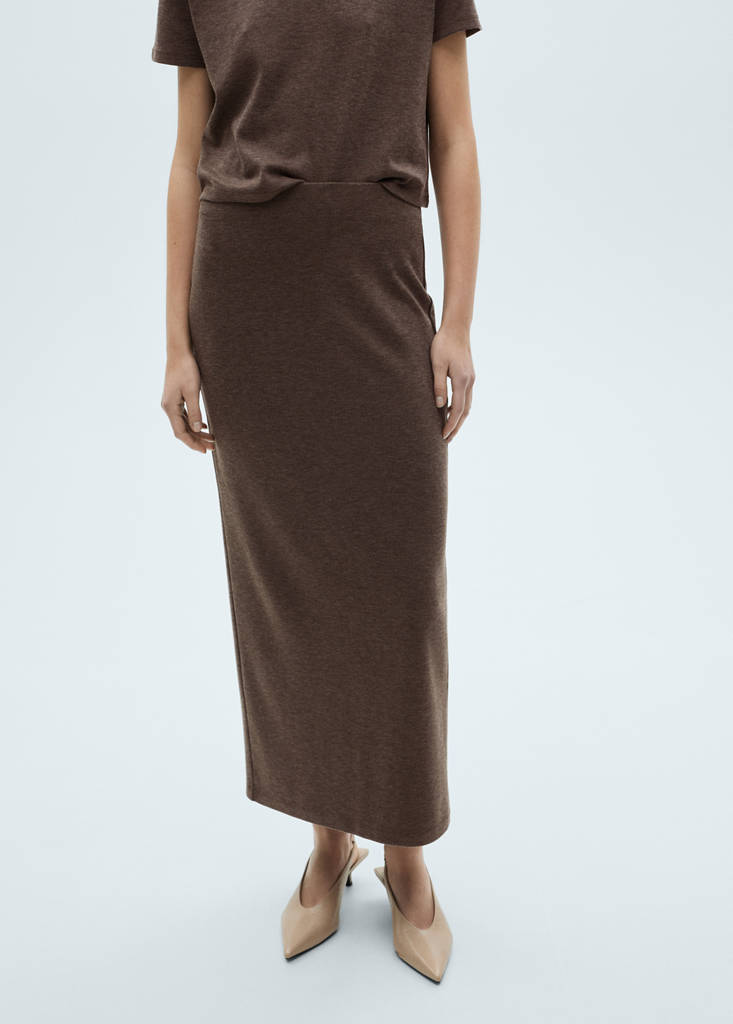 Bande élastique. Tissu en maille. Tissu léger. Crayon. Coupe midi. Taille mi-haute. Taille élastiquée. Détail d'ouverture à l'arrière. Sans fermeture. Sans doublure intérieure. Maille. Design long. Total look. Coupe ajustée