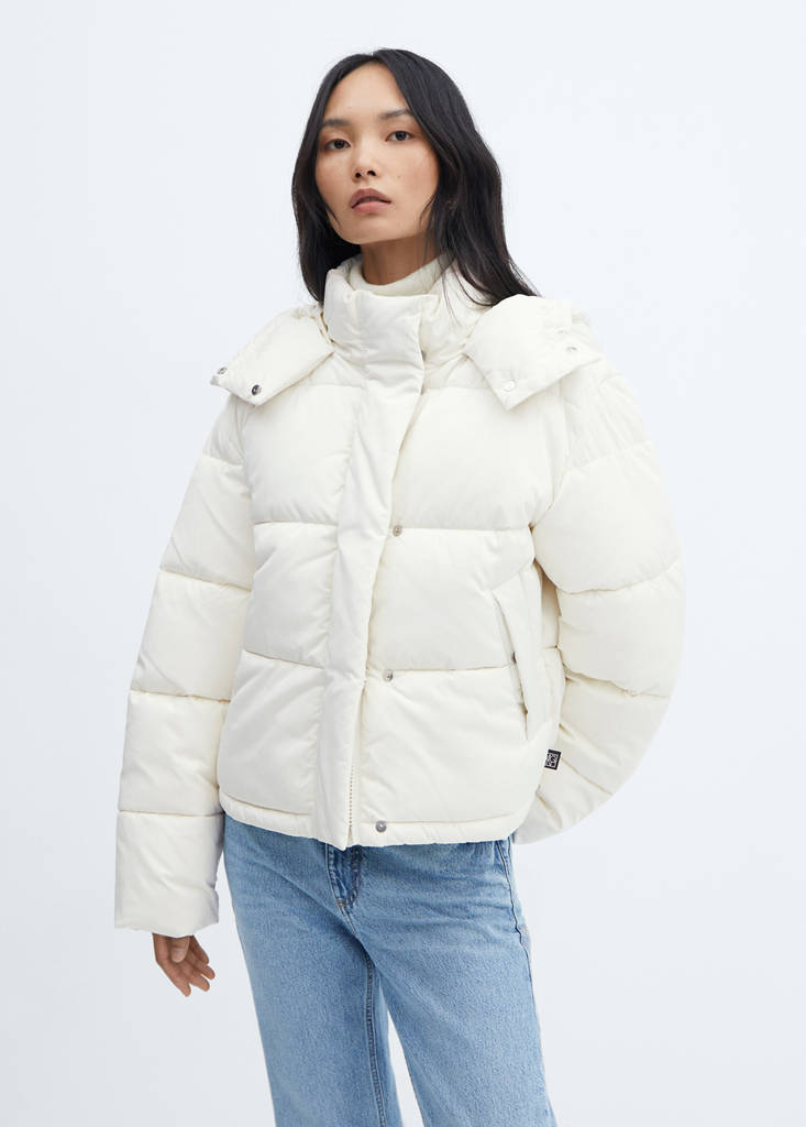 Design matelassé. Coupe courte. Coupe droite. Col montant. Manche longue. Deux poches latérales. Fermeture Éclair et boutons-pression dissimulés. Capuche avec fermeture à bouton. Doublure. Hydrofuge : La finition résistante de ce vêtement protège contre les pluies légères, repoussant le contact avec l'eau et les gouttes de pluie
