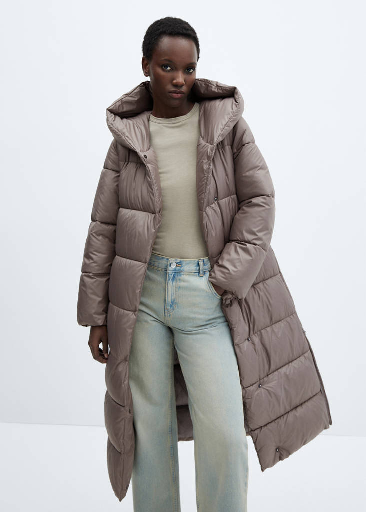 Design matelassé. Coupe croisée. Design long. Coupe droite. Col croisé. Manche longue. Fermeture Éclair à l’avant. Capuche. Poches latérales. Ouvertures zippées sur les côtés. Doublure. Hydrofuge : La finition résistante de ce vêtement protège contre les pluies légères, repoussant le contact avec l'eau et les gouttes de pluie