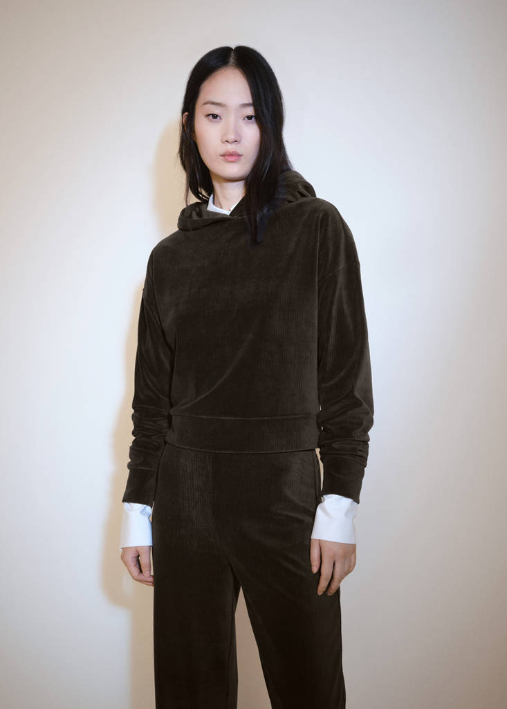 Tissu en velours côtelé. Coupe droite. Col rond. Avec capuche. Manches longues avec poignets élastiques. Sans fermeture. Total look
