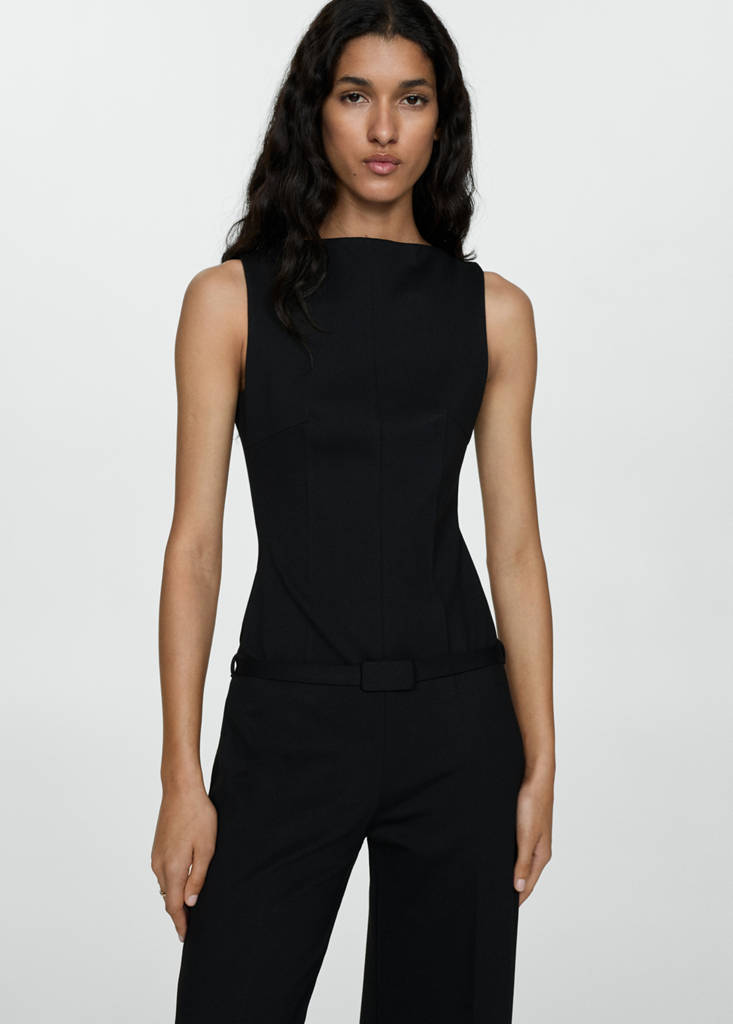 Tissu fluide. Design long. Coupe droite. Col bateau. Coutures décoratives. Sans manches. Passants de ceinture. Ceinture décorative. Fermeture arrière. Fermeture Éclair