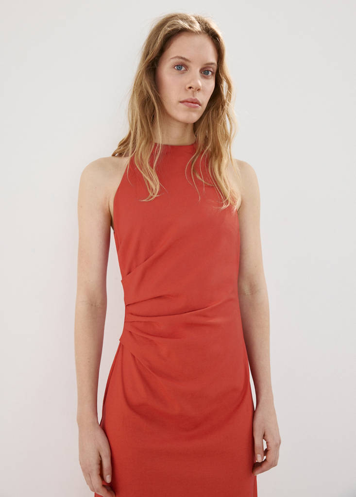 Coupe midi. Coupe ajustée. Détail drapé. Col halter. Sans manches. Fermeture éclair au dos. Doublure intérieure
