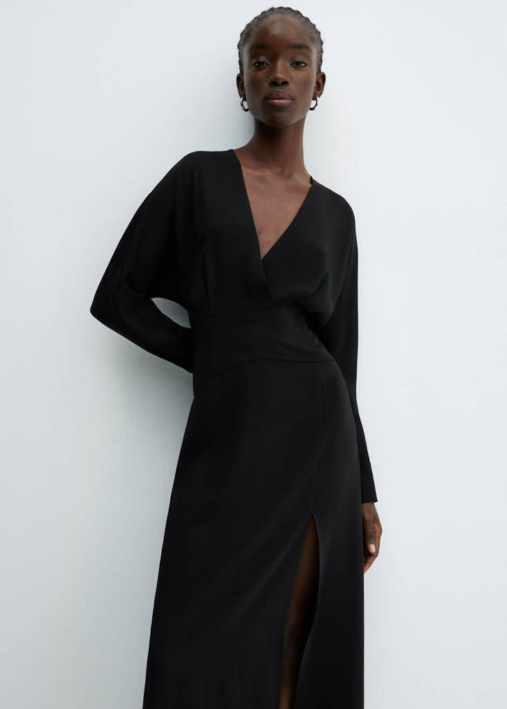 Tissu fluide. Design long. Design évasé. Décolleté en V croisé. Manches longues et poignets boutonnés. Fermeture par bouton à l'arrière. Fermeture Éclair invisible à l'arrière. Fente latérale. Doublure. Disponible en grande taille