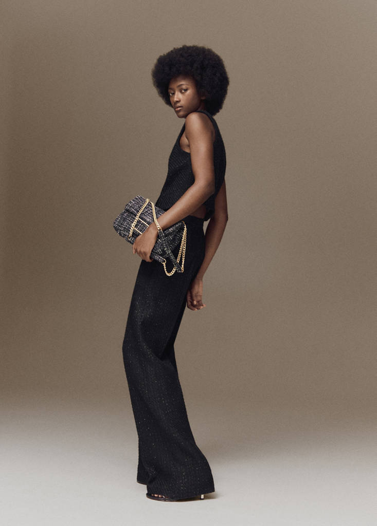 Tissu tweed. Tissu de coton mélangé. Grande taille. Anse double. Anse en chaîne. Anse courte. Compartiment intérieur. Fermoir métallique aimanté. Boucle décorative