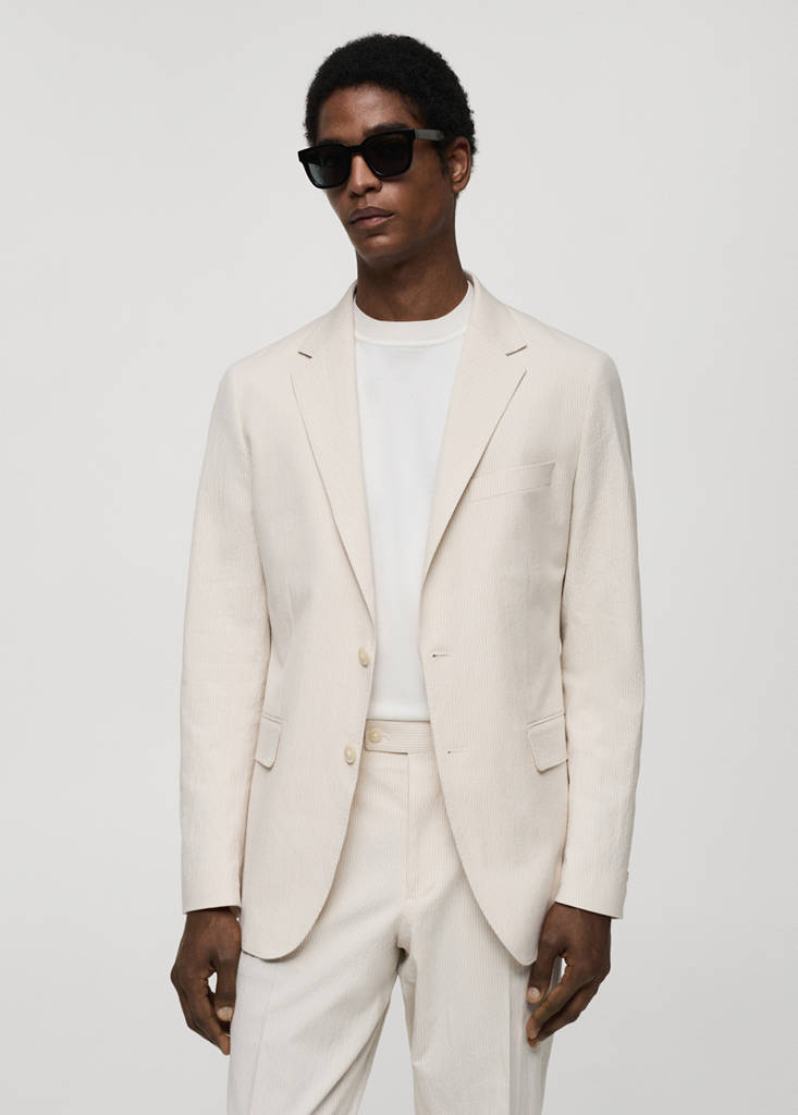 Slim fit. Tissu en coton. Tissu seersucker. Motif à rayures. Revers à encoche. Manches longues et poignets boutonnés. Poche passepoilée sur la poitrine. Deux poches à rabat à l’avant. Trois poches passepoilées à l’intérieur. Double fente à l’arrière sur le bas. Demie doublure. Fermeture avant avec boutons