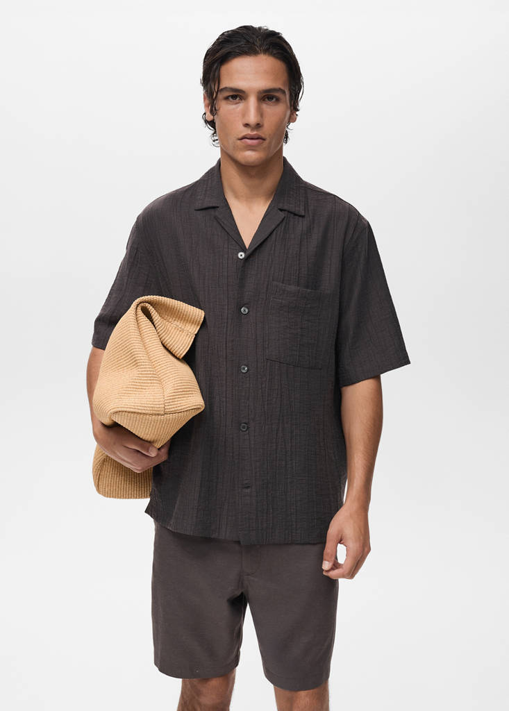 Tissu mélange Lyocell. Coupe regular. Col bowling. Effet froissé. Poche plaquée sur la poitrine. Manche courte. Ourlet droit. Petites fentes latérales en bas