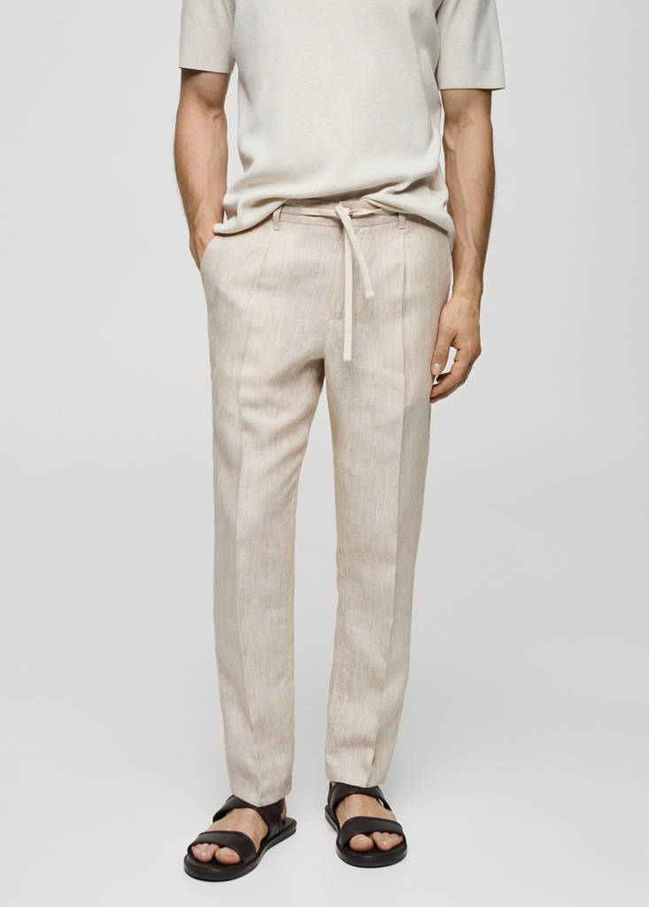 Slim fit. Tissu 100 % lin. Imprimé à rayures verticales. Passants de ceinture. Fermeture avant à double boutonnage et fermeture éclair. Taille élastique avec cordon ajustable. Détail de pli à l'avant. Deux poches avant. Deux poches passepoilées avec bouton à l'arrière. Détail de pli marqué à l'avant et à l'arrière