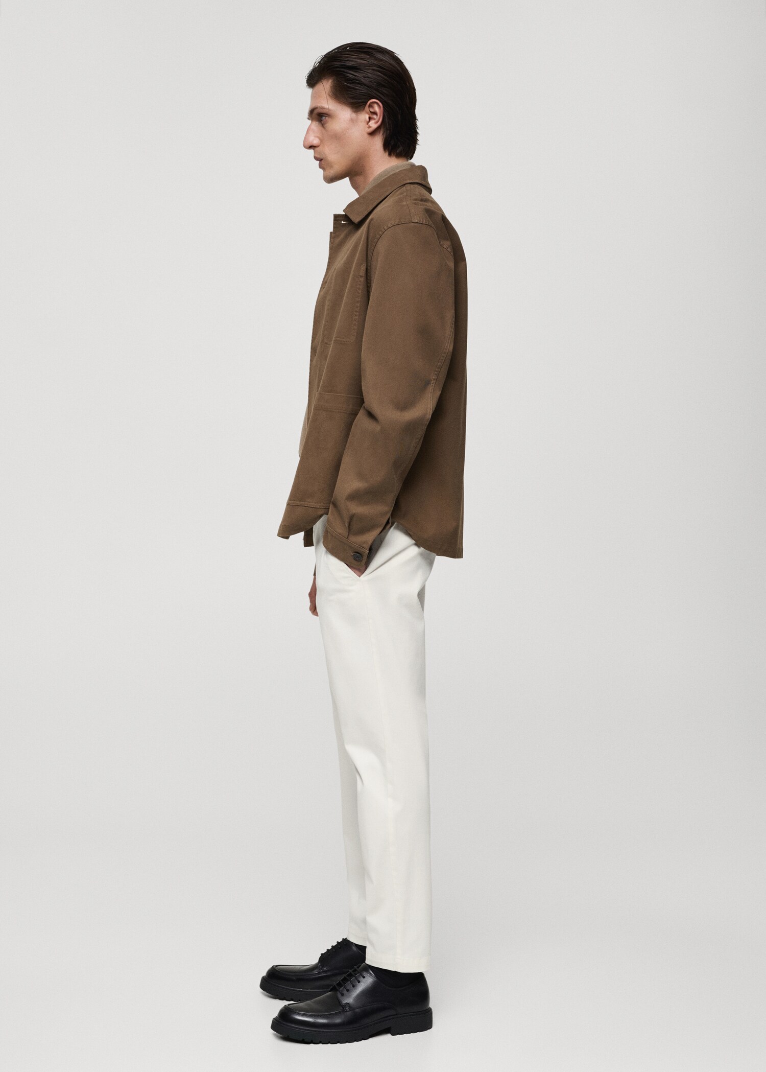 Collection Essentiels. Bande élastique. Tissu léger. Deux poches latérales. Le mannequin porte une taille 42. Tissu de coton et polyester mélangés. Slim fit. Imprimé floral. Fermeture à boutons. Manche courte. Col classique.