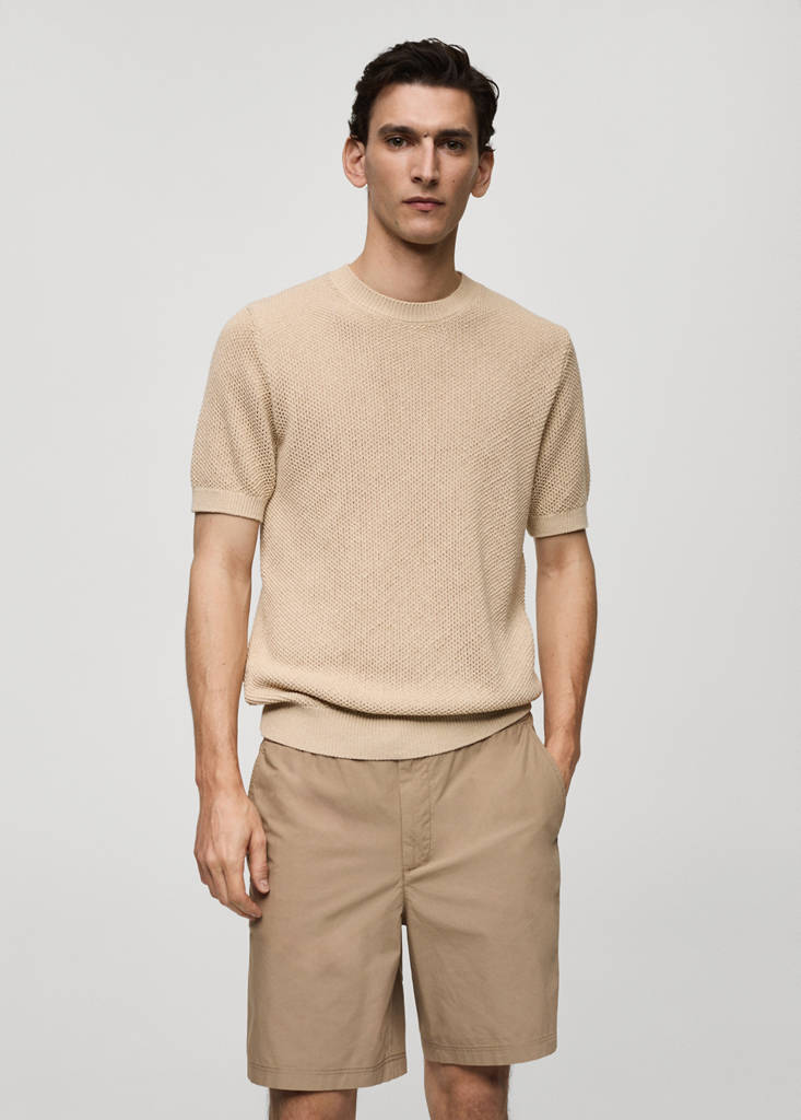 Tissu en mélange de coton. Tissu en grosse maille. Col rond. Manche courte. Bas élastiqué. Bords côtelés au niveau du col, des manches et sur le bas