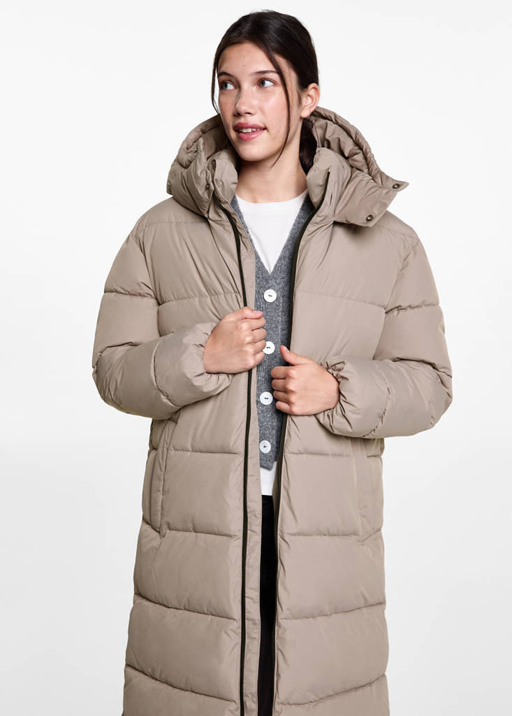 Design matelassé. Coupe droite. Design long. Capuche avec fermeture à bouton. Deux poches latérales. Fermeture à glissière