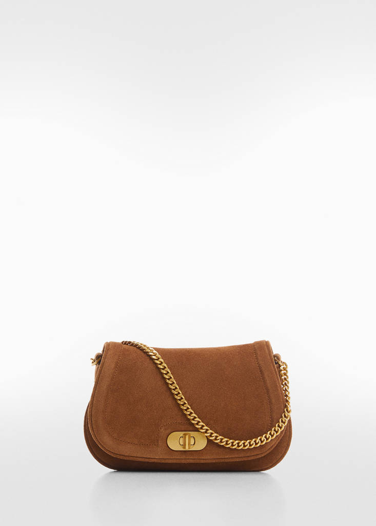 100% bovine leather. Crossbody bag. Medium. Adjustable and detachable long strap. Short chain strap. Flap closure with snap button. Interior pocket. Inner lining