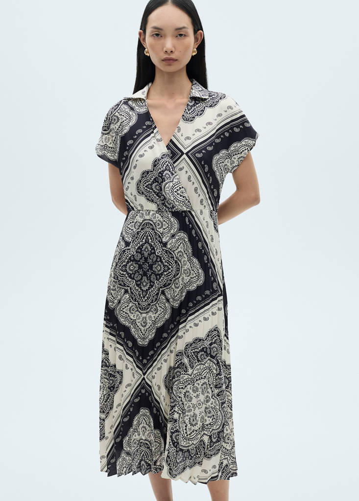 Fluid fabric. Paisley print. Midi design. Crossed V-neck. A-line design. Shirt-style. Pleated skirt. Shirt collar. Short sleeves.